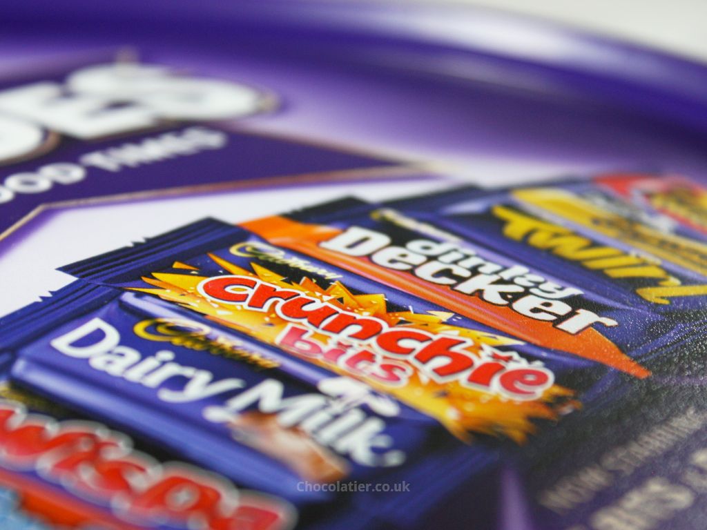 Clearly, when compared to Quality Street, there are much fewer creme centred chocolates in the selection. The divide between chocolate-based bars and the chewy caramels, fudges, and toffees is fairly even. You'll likely find slightly more caramels, fudges, and toffees than chocolate bars, but the difference will probably be negligible.