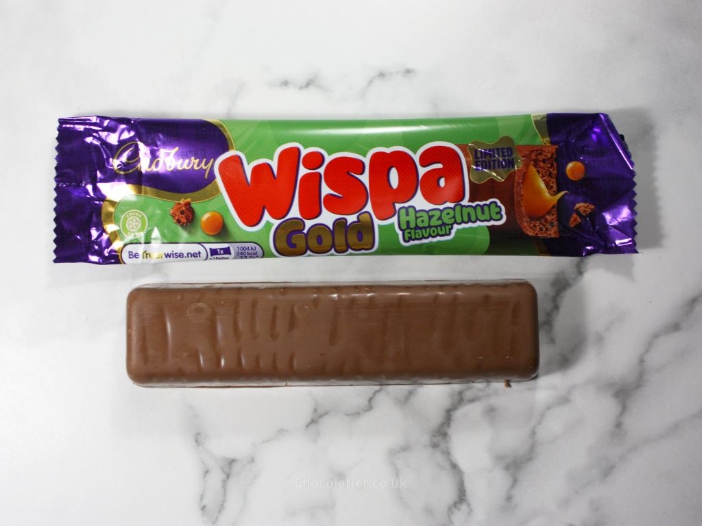 This limited edition bar follows much the same format as a Wispa Gold, except for the fact that the caramel is flavoured with hazelnut. The nutty taste is derived from a flavouring rather than chunks of hazelnut, so don't expect a crunchy texture. Quite the contrary.