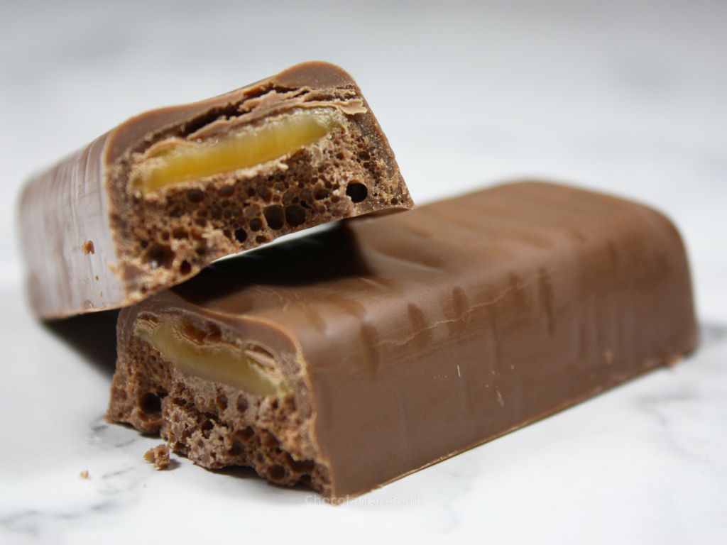 If you've ever eaten a Cadbury Wispa bar, this, on the face of it looks exactly the same. From the exterior, it's identical. It's aerated chocolate coated in a shell of milk chocolate. Wispa Gold introduced a layer of caramel on the top of the aerated chocolate.
