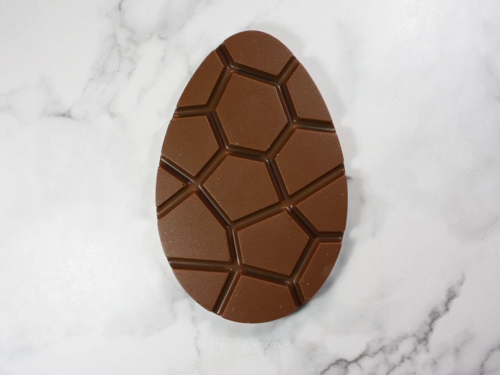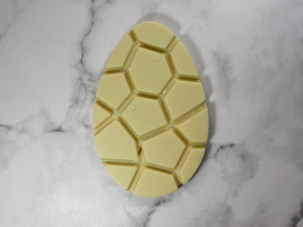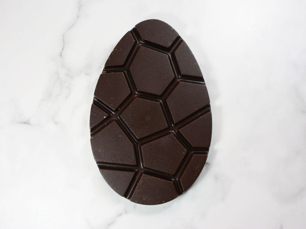 Each of the slabs has a nice mirror-like sheen to it and a satisfying crisp snap. The mould used to cast these egg-shaped bars appears to have a slight dotty texture over it and this pattern is seen on the face of the slabs.