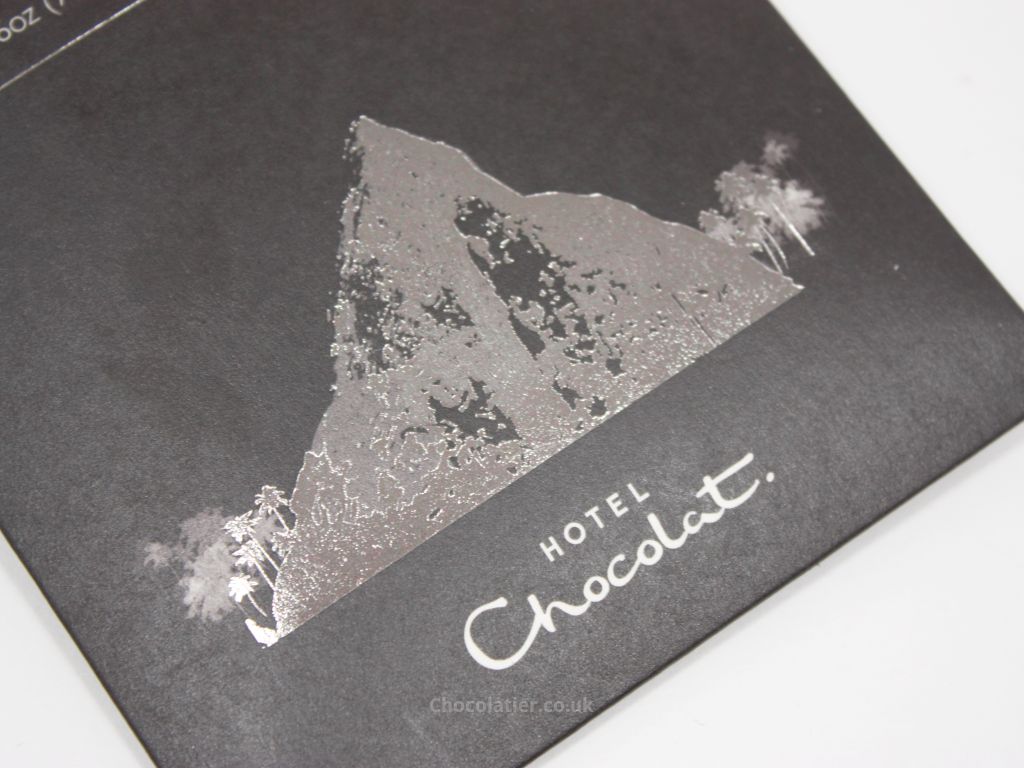 An illustration of Saint Lucia's Pitons in silver-foil print sits above the crisp white Hotel Chocolat logo, adding a lovely touch of elegance to the matt black carton.