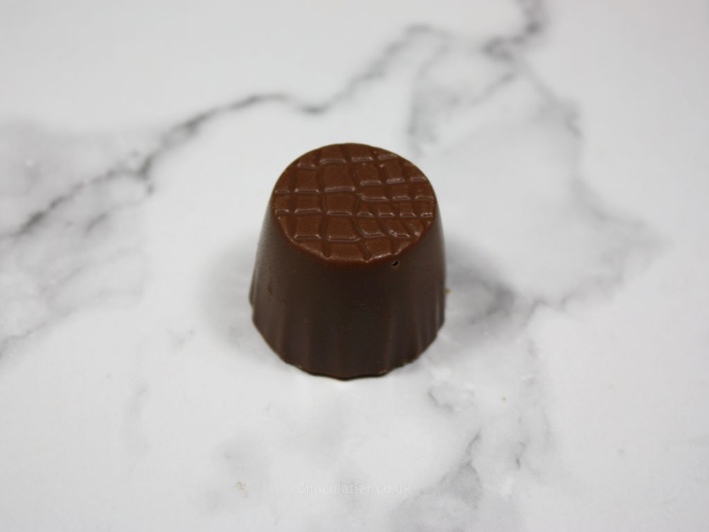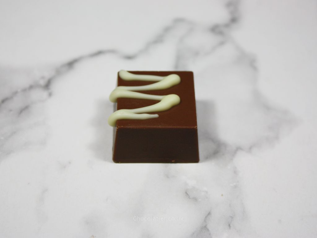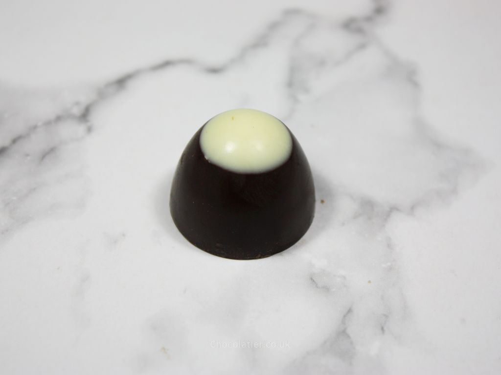- Passion Fruit Posset: A passion fruit white chocolate truffle inside a milk chocolate shell with white chocolate decoration.