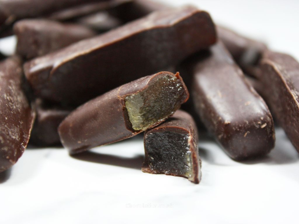 The milk chocolate-coated candied grapefruit strips comes in at around 401kcal per 100g, with 37% sugars. The dark chocolate-coated candied ginger batons comes in at around 288kcal per 100g, with 18% sugars.