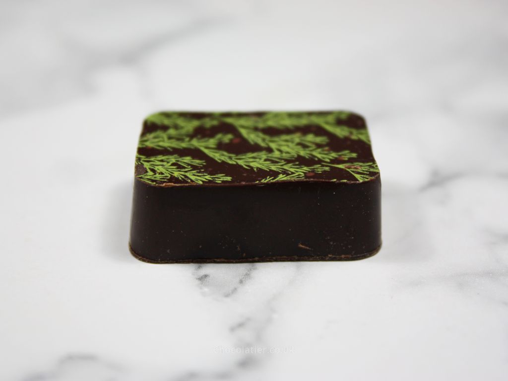 A rich dark chocolate aroma, laced with smokey and tobacco notes, and a pretty shimmery finish lured me in to biting my way through this chocolate dome. As I did, I discovered a ganache layered with a jelly top. This bonbon was dense, rich and satisfying, yielding floral, berry and fruity flavours along the way. The overall effect was quite subtle, though.