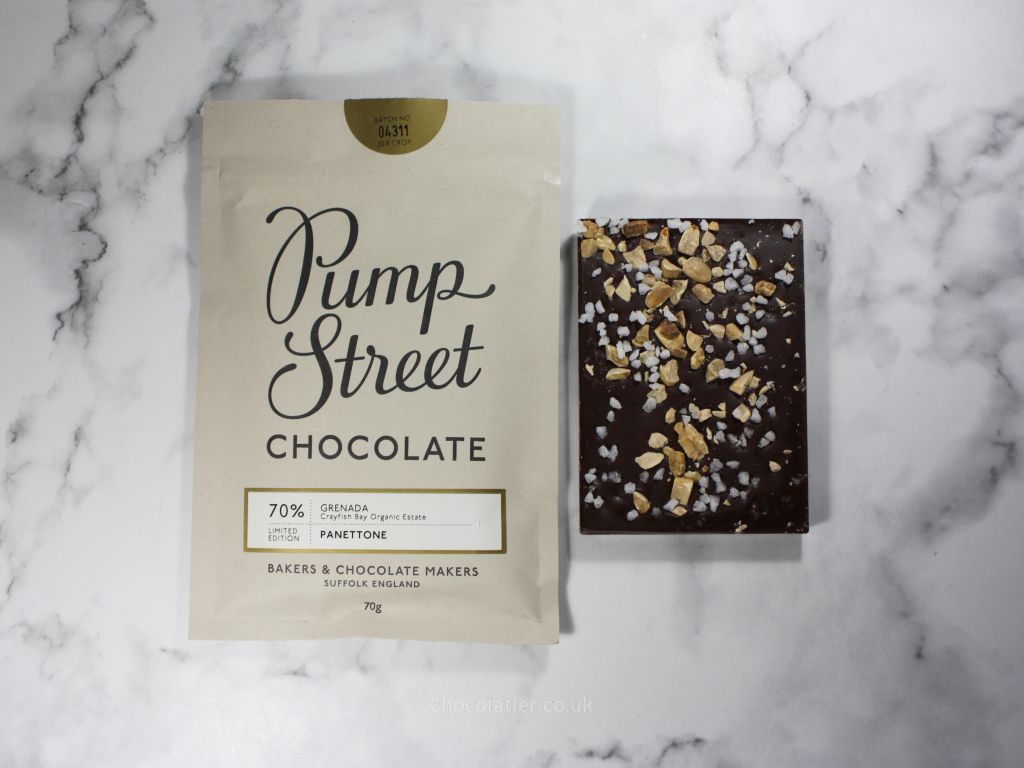 - Verdict: While the combination of orange and almonds works very well with the smokey, rich Grenadian dark chocolate, it doesn't really remind me of an Italian panettone. The chocolate has such a punchy flavour profile that the subtle nuances of panettone are lost. That may well be as I'm comparing it to a supermarket panettone rather than Pump Street's Bakery famed Panettone which uses sourdough, is filled with peel and raisins, and is toped with almonds and sugar crystals. In that context, it's perhaps the chocolatey equivalent of their festive delicacy. Nevertheless, it's still a very characterful bar with a festive feel to it.