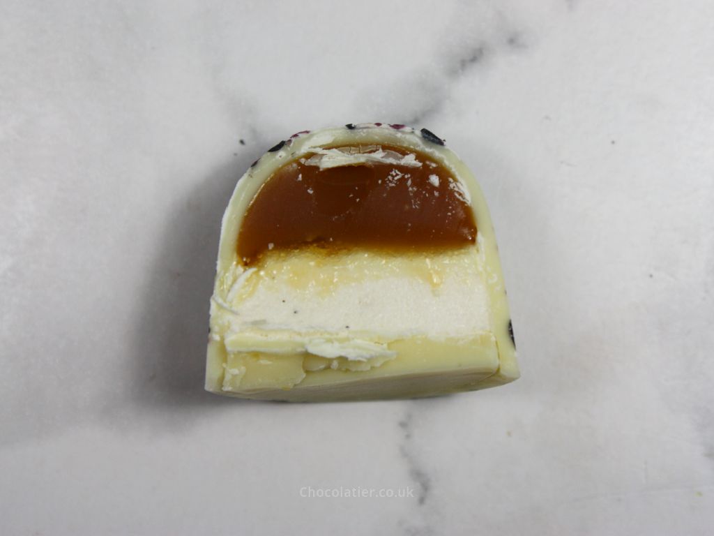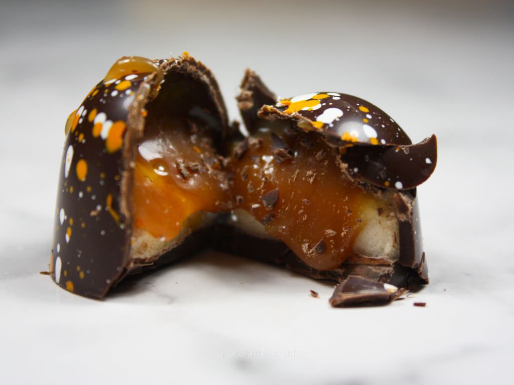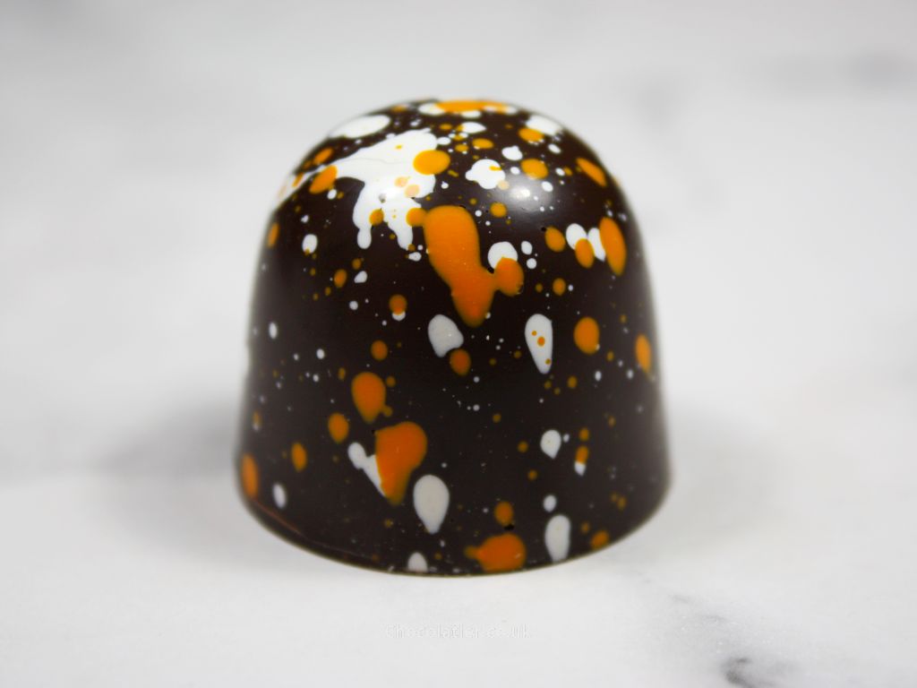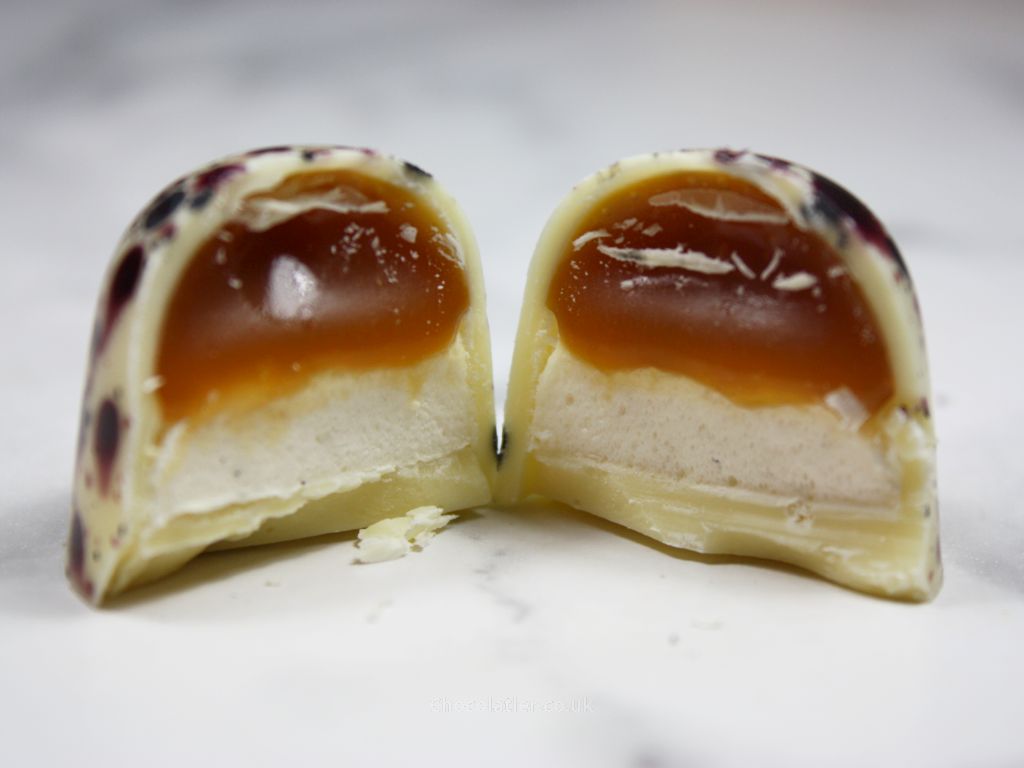 The dark chocolate (white and orange spots) and salted caramel are an unstoppable force that dwarfs the flavour of the delicate marshmallow. At the other end of the scale, the white chocolate and caramel duo over-emphasise the sweet and salty characteristics of the bonbon. The milk chocolate bonbon strikes the right balance between the two for me.