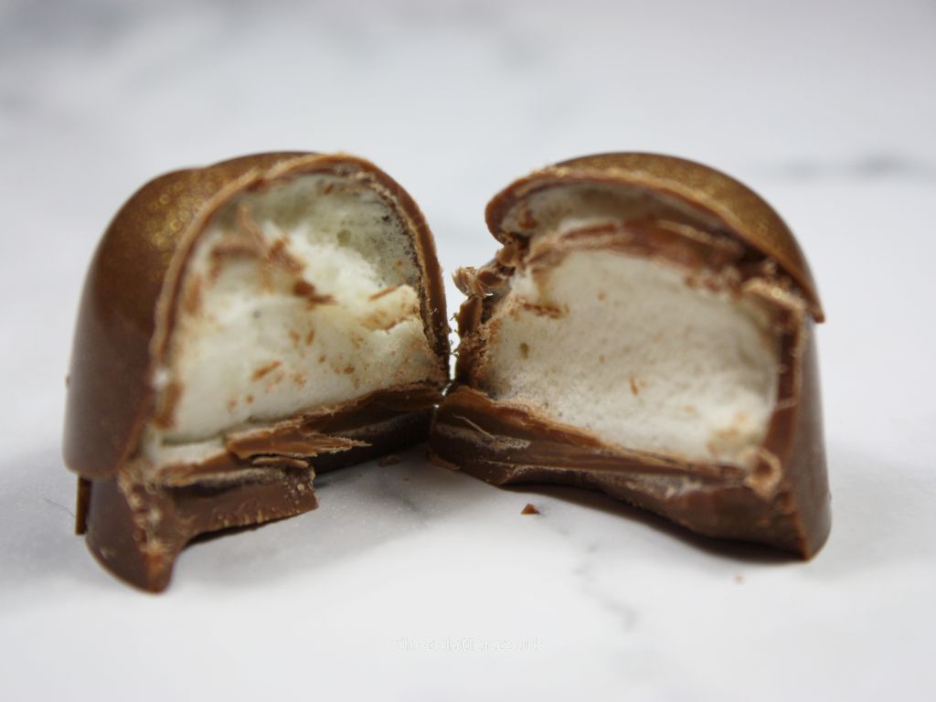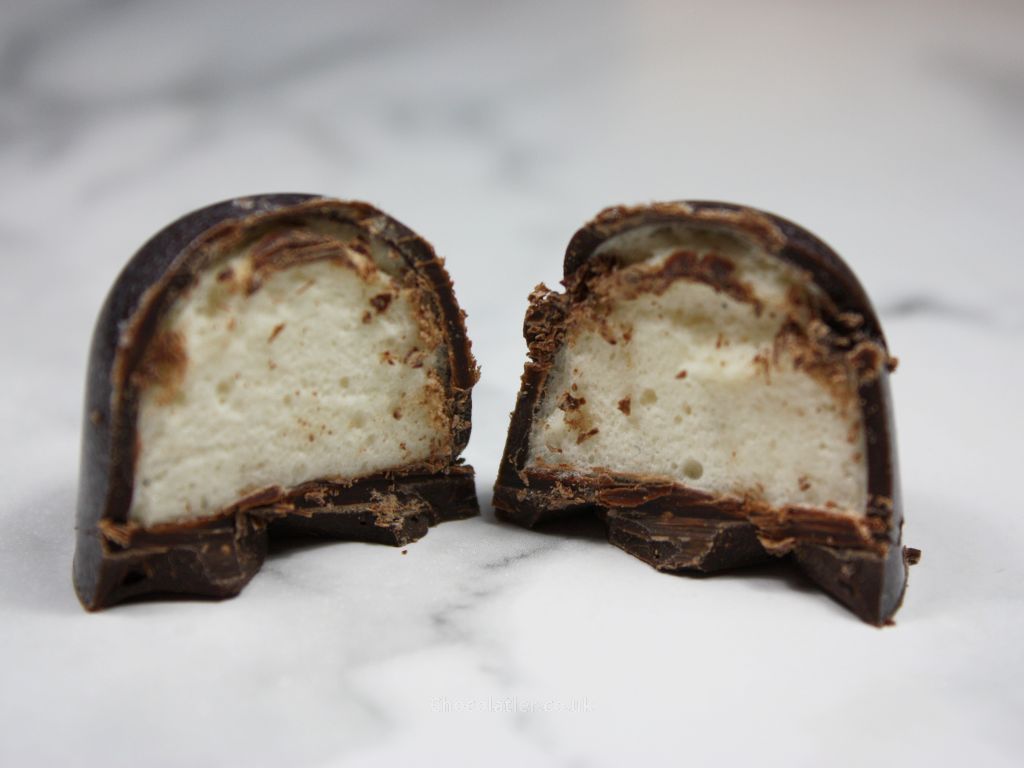Paired against the dark chocolate (the silver one), the flavour is dwarfed by the heavy cocoa notes and the mild bitterness of the shell. The marshmallow melts away without a trace while the dark chocolate stomps around, making its presence known.