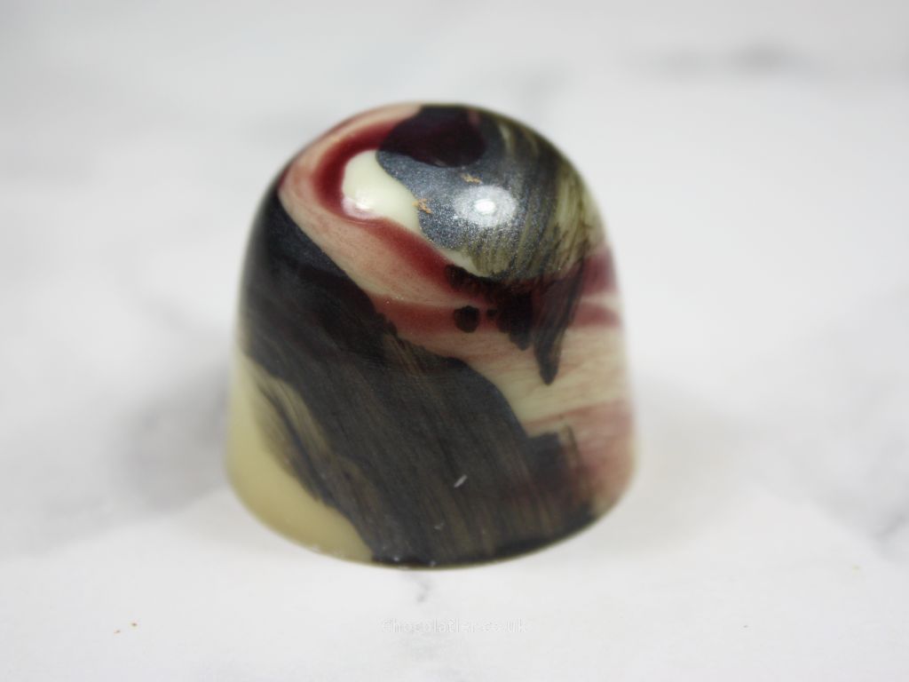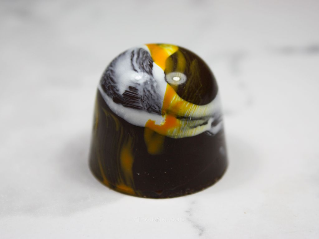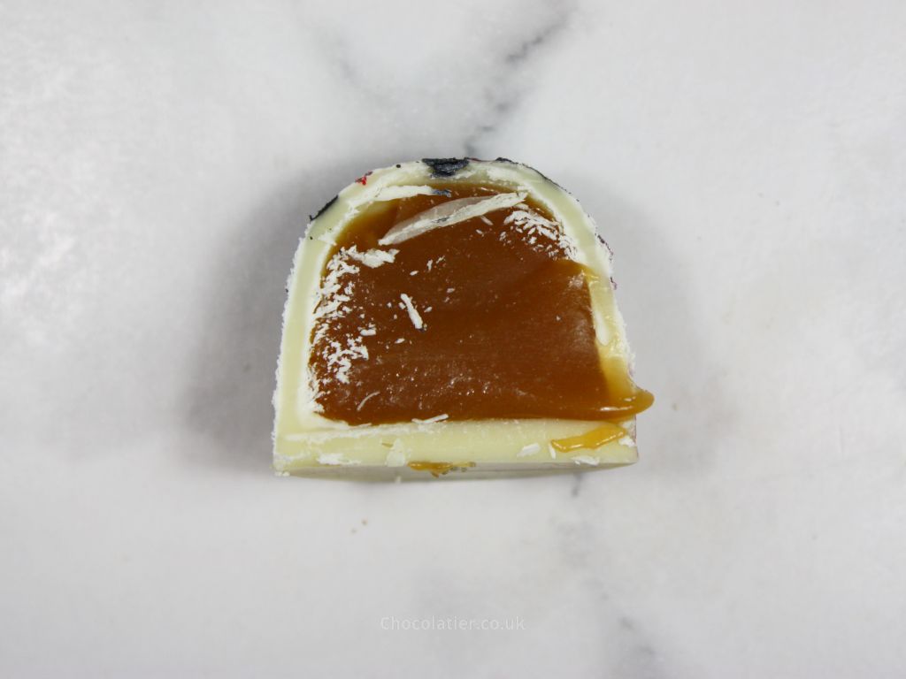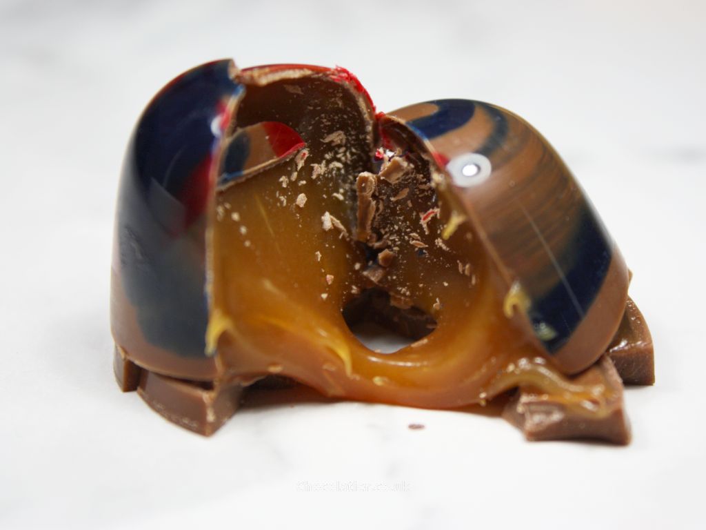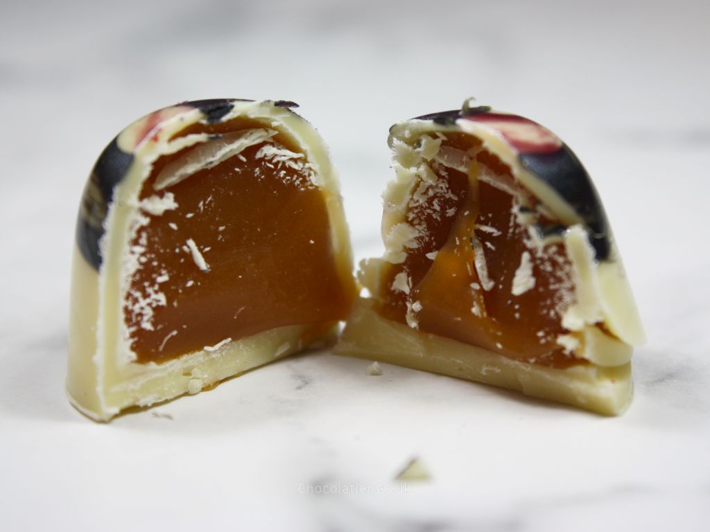 My preference is the milk shell (the red and blue swirls) as the creaminess of the Belgian chocolate pairs really well with the sweet, smooth, gooey centre. The dark shell (orange, white and yellow swirls) adds richness and a touch of bitterness. It works well, but the shell tries to dominate the delicious flavour of the caramel filling. Similarly, while the white shell (black and red swirls) ramps up the vanilla qualities in the flavour profile, it over-enhances the sweet and salty qualities. Perhaps a different flavour, such as a raspberry caramel, would work well against the white shell, but for me, the sweet spot here is the milk chocolate base.