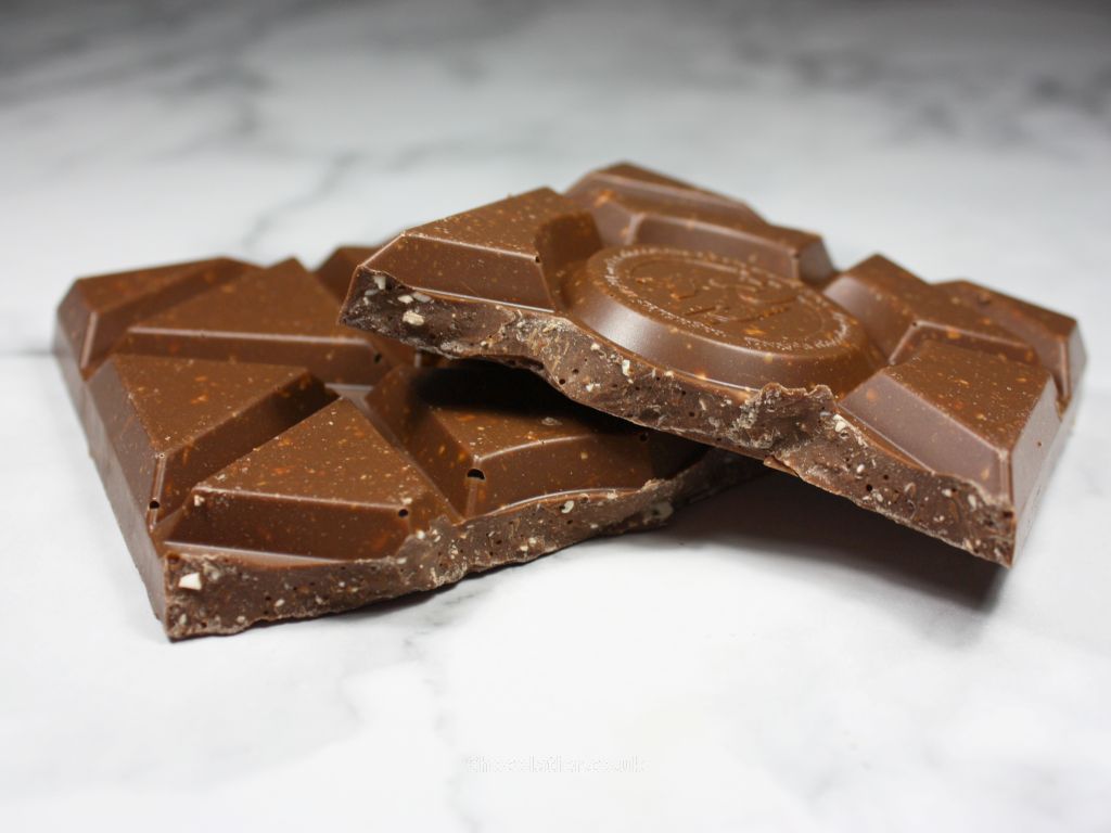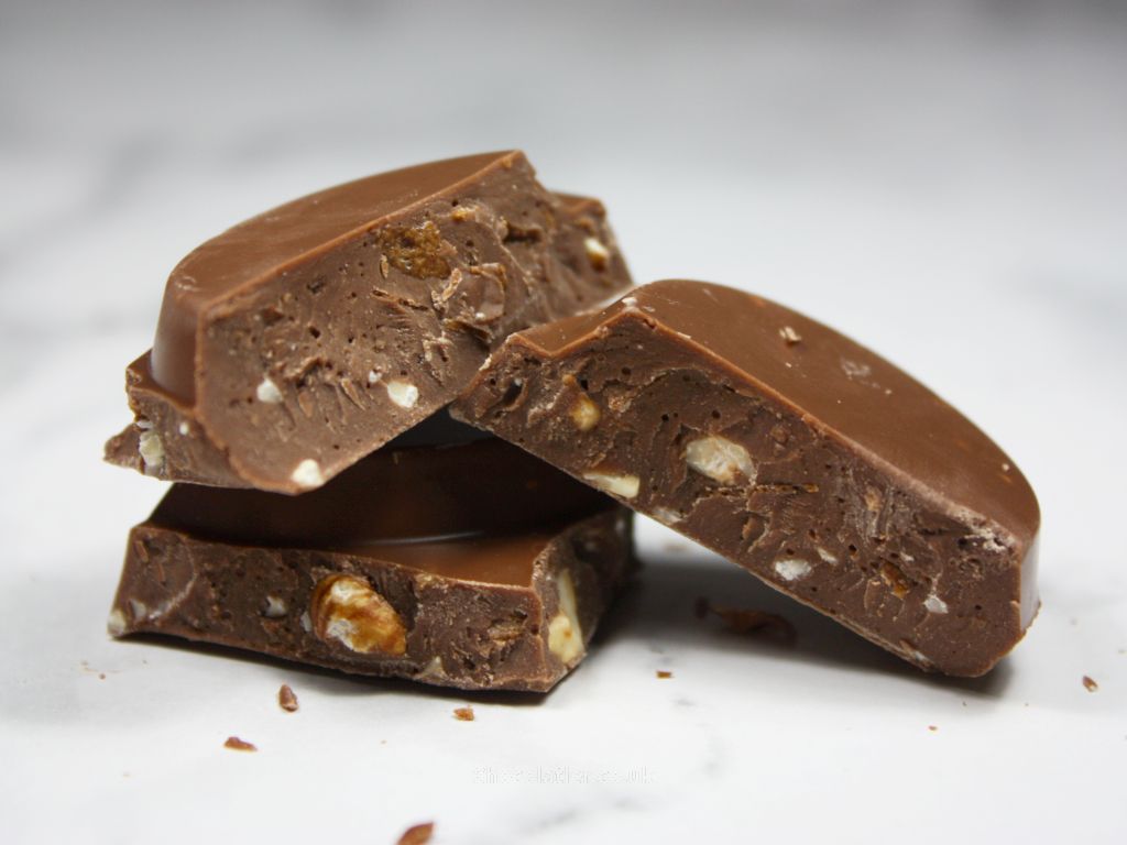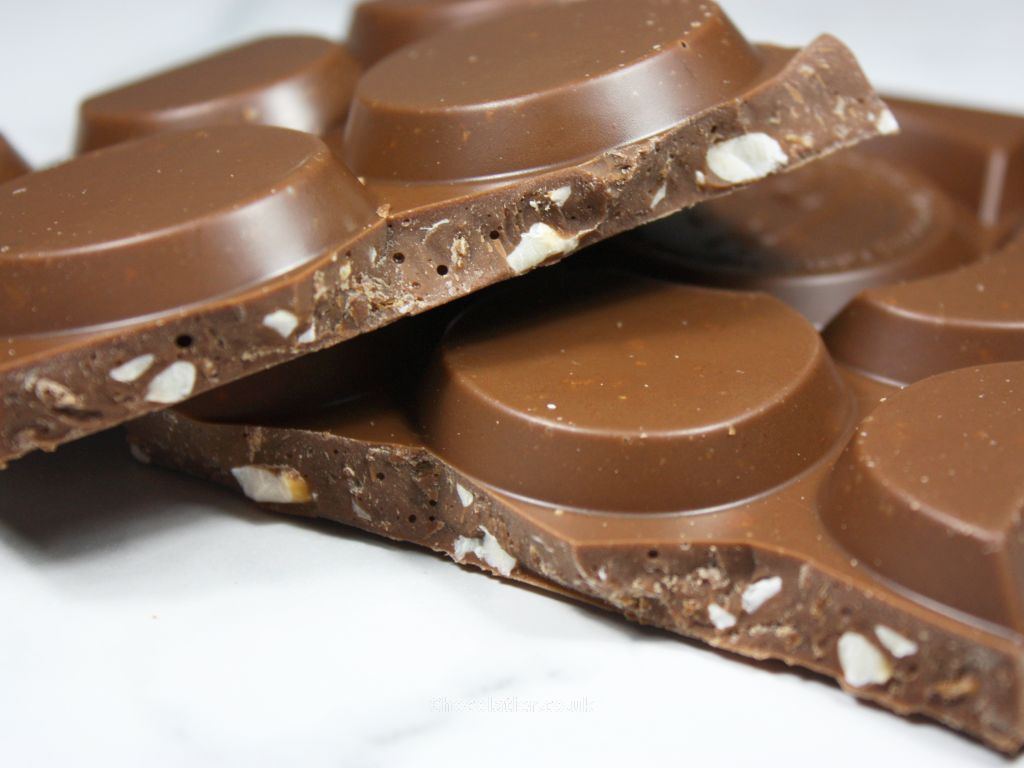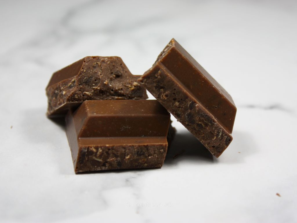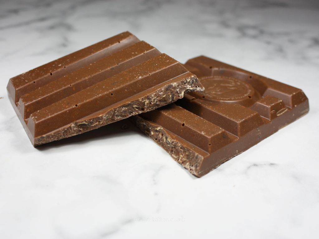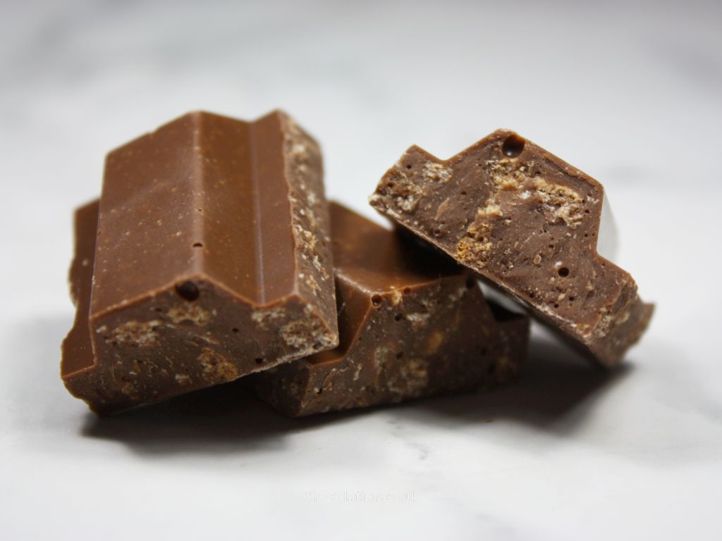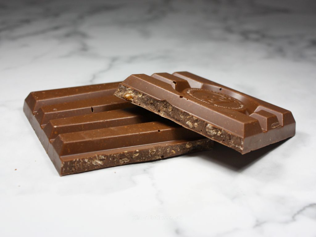 - What is it like? A familiar buttery aroma bleeds from this bar, as it does for the each of the remaining bars in this collection thanks to a shared 32% milk chocolate base. The flavour of the sweet chocolate itself yields general cocoa notes together with a faint hint of caramel notes, which is typical of chocolate I've tasted that is made using West African beans. Add in the waffle and cookie pieces and out of the four bars, this one tastes closest to its inspiration bar. The flavour of the inclusions adds a gentle malty flavour with a hint of the flavour of wafers, while texturally they add crunch. The chunky nature of the chocolate dwarfs the inclusions, so, this feels more chocolate-heavy than a KitKat (a win for those that reckon there's not enough chocolate on a KitKat).