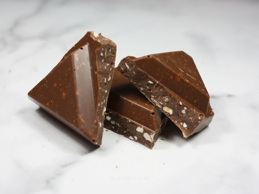 - What is it like? This uses the 32% milk chocolate base and again, it delivers the same aroma and flavour. The inclusion of crunchy and slightly chewy flecks of almond honey nougat adds a similar texture to that of a Toblerone. The chunky size of Toblerone's triangles compare well to the chunky depth of Tony's' bars too.