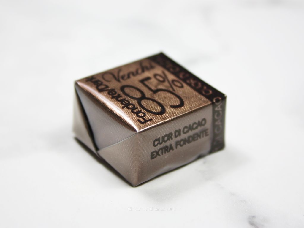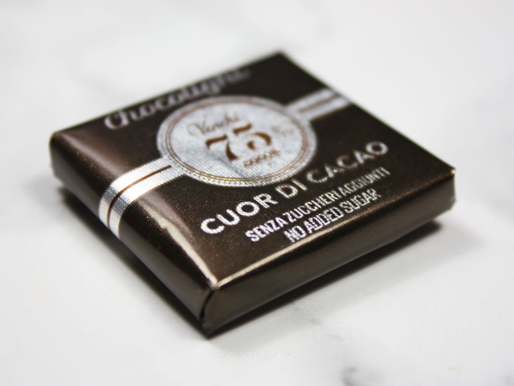 This square of 75% dark chocolate contained no added sugar, sweetened instead by maltitol, a sugar alcohol used as a sugar substitute. The Venchi website warned of a laxative effect if too many were consumed in a single serving...