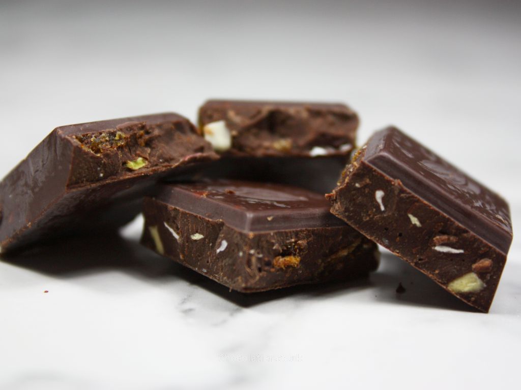 The matt look bar releases dark, rich, and earthy aromas that include smoke, tobacco, and molasses. A clean snap is music to my ears. The chocolate is slow to melt, but when it does, it yields a dry and woody flavour to begin, along with a hint of smokiness and nuttiness. The inclusions of almonds, dates, pistachios, and cashews add texture, while the dates also naturally add sweetness as well as fruity vibes. The dryness subsides too as the chocolate melts. All this helps round the flavour, too, leaving rich, fruity chocolate notes in the aftertaste.